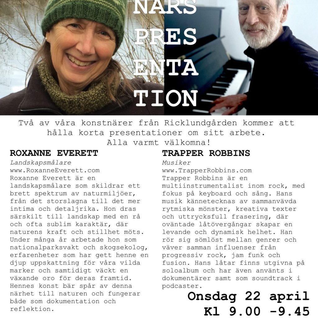 ”Jag spenderade en månad på Ricklundgården sommaren 2019 tillsammans med min partner Matz Engdahl som är dekormålare och musiker. Gården är belägen i en overkligt vacker miljö precis vid en sjö med flera närliggande fjäll. Det är inspirerande att få ta del av det som Emma och Folke Ricklund skapat på denna plats och den lust som gården utstrålar. Folkes ateljé är rymlig och ljus med högt i tak och en liten balkong inomhus med utsikt över fjällen. Vi hade en fantastisk månad med utflykter – vi vandrade, var på festival i Vilhelmina, besökte Fatmomakke och fick samtidigt ro till fokuserat arbete. Vi kom väl överens med de som jobbar med Ricklundgården, de är välkomnande och engagerade. I slutet av månaden bjöd vi in till en utställning och konsert i Folkes ateljé för människor vi hade träffat under vår tid där och som bodde i trakten. Jag kan verkligen rekommendera Ricklundgården för att hitta ro till konstnärligt arbete på en enastående plats.”
