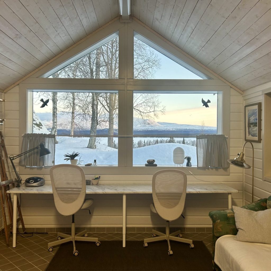 ”I SPENT A MONTH AT RICKLUNDGÅRDEN IN THE SUMMER OF 2019 TOGETHER WITH MY PARTNER MATZ ENGDAHL, WHO ARE DECOR PAINTER AND MUSICIAN. THE STUDIO IS LOCATED IN AN INCREDIBLY BEAUTIFUL ENVIRONMENT RIGHT BY A LAKE AND CLOSE TO SEVERAL MOUNTAINS. IT IS INSPIRING TO TAKE PART OF WHAT EMMA AND FOLKE RICKLUND CREATED IN THIS PLACE AND THE DESIRE THAT BEAMS OUT OF THE HOUSE. FOLKES STUDIO IS SPACIOUS AND BRIGHT WITH HIGH CEILINGS AND A SMALL INDOOR BALCONY WITH A VIEW OF THE MOUNTAINS. WE HAD A FANTASTIC MONTH WITH EXCURSIONS – WE WALKED, WERE AT A FESTIVAL IN VILHELMINA, VISITED FATMOMAKKE AND AT THE SAME TIME WE FOUND PEACE FOR FOCUSED WORK. AT THE END OF THE MONTH, WE INVITED TO AN EXHIBITION AND CONCERT IN FOLKES STUDIO FOR PEOPLE WHO LIVED IN THE AREA AND WHOM WE HAD MET DURING OUR TIME THERE. I CAN REALLY RECOMMEND RICKLUNDGÅRDEN TO FIND PEACE FOR ARTISTIC WORK IN A UNIQUE PLACE.”