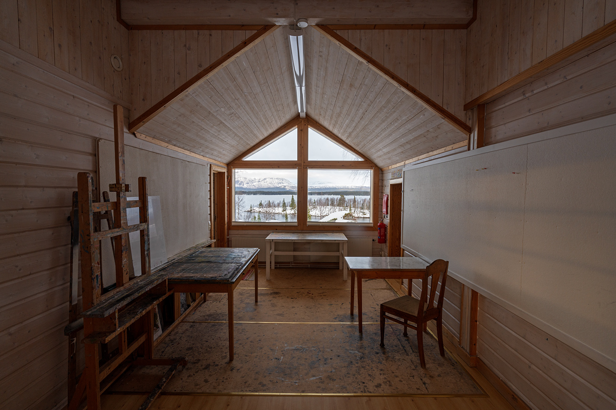 Det finns upphängningsmöjligheter på väggarna inne i ateljén om du vill sätta upp din konst. I ateljén finns även staffli och ett bord med kontorsstol.